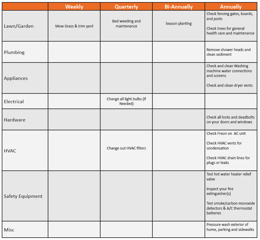 Gabe's Crossing HOA will offer a scheduled preventative maintenance checkup to keep your home in great health. For some items, if we don't offer repair we will refer you to trusted vendors. Included in this maintenance is weekly grass mowing, seasonal plantings, and bed weeding. To view a complete list of preventative maintenance items, download the full packet.